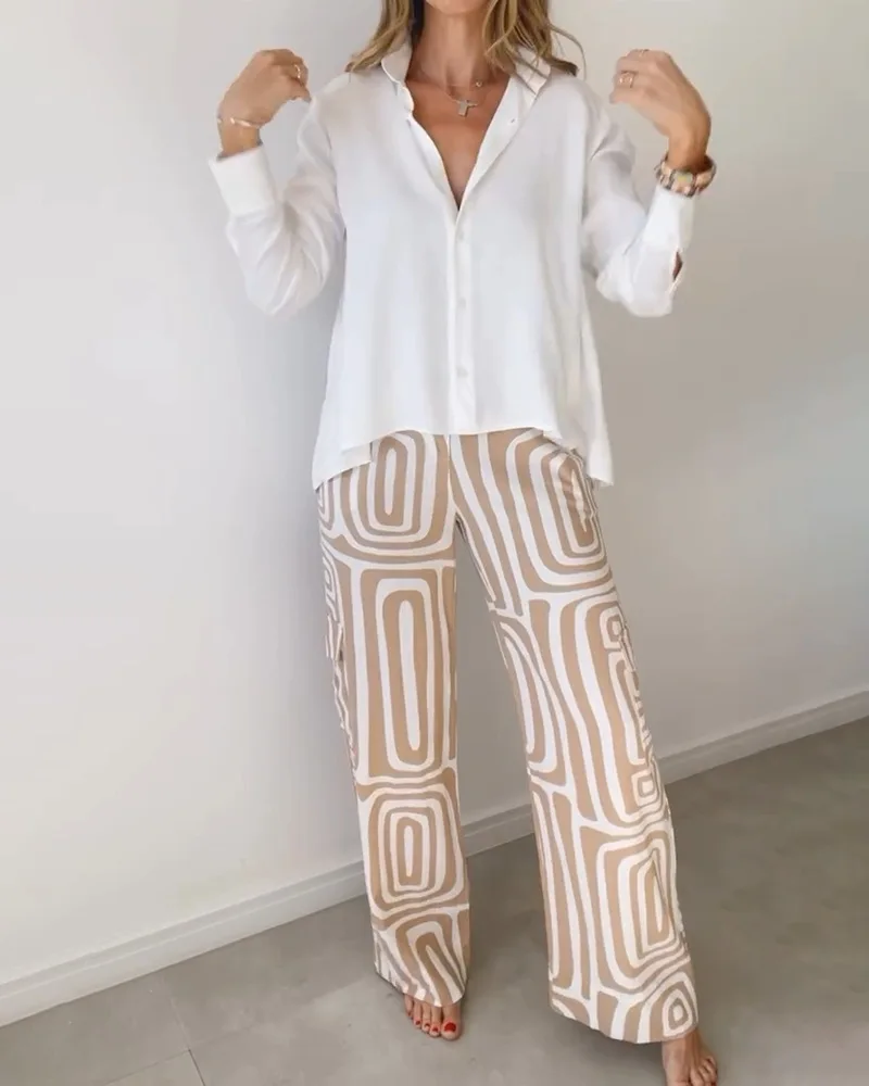 Conjunto de blusa blanca y pantalones anchos para mujer, traje informal 2024, camisa con estampado digital, pantalones holgados, conjunto de dos piezas